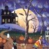 Description: picture of a halloween village, with a haunted house and bats and that sort of thing